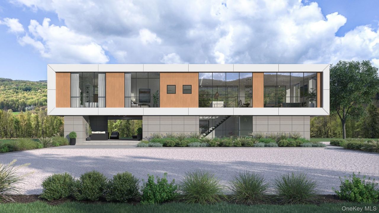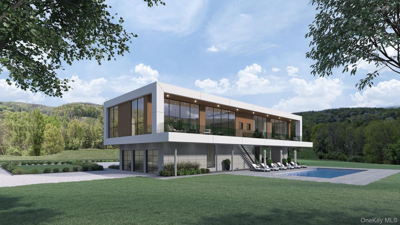 Perched above the Clove Valley just minutes from the Village of Millbrook, this exceptional modern residence is designed to celebrate light, landscape, and elevated living in the heart of the Hudson Valley. Set on 51.38 acres of rolling countryside, the home offers breathtaking, panoramic views and a rare sense of privacy, while remaining conveniently close to village amenities. The proposed 3,542-square-foot design features four bedrooms and four and a half bathrooms, thoughtfully arranged to maximize views and flow. Soaring ceiling heights-12 feet on the upper level and 10 feet on the lower level-create an airy, gallery-like atmosphere throughout. Expansive walls of glass frame the Clove Valley below, making the landscape an integral part of the living experience. Designed for both daily living and entertaining, the home includes a dedicated gym or media room, and open-concept living spaces that extend seamlessly to outdoor dining and kitchen areas. The entire southern elevation features a covered terrace with access from public spaces, as well as the primary suite, and guest suite. Opposite the hall is another en-suite guest room. A 20' x 40' pool anchors the outdoor experience, offering a front-row seat to the surrounding scenery. A three-car garage adds convenience without compromising the home's clean, modern aesthetic. All BOH approvals and building plans are in place, allowing for a streamlined path to construction. As currently designed, the residence is highly efficient. Alternative configurations are also available at higher price points, offering flexibility to further tailor the home to your vision. Just ten minutes from Millbrook's charming village center, this remarkable offering combines cutting-edge modern design, environmental responsibility, and one of the Hudson Valley's most dramatic settings.